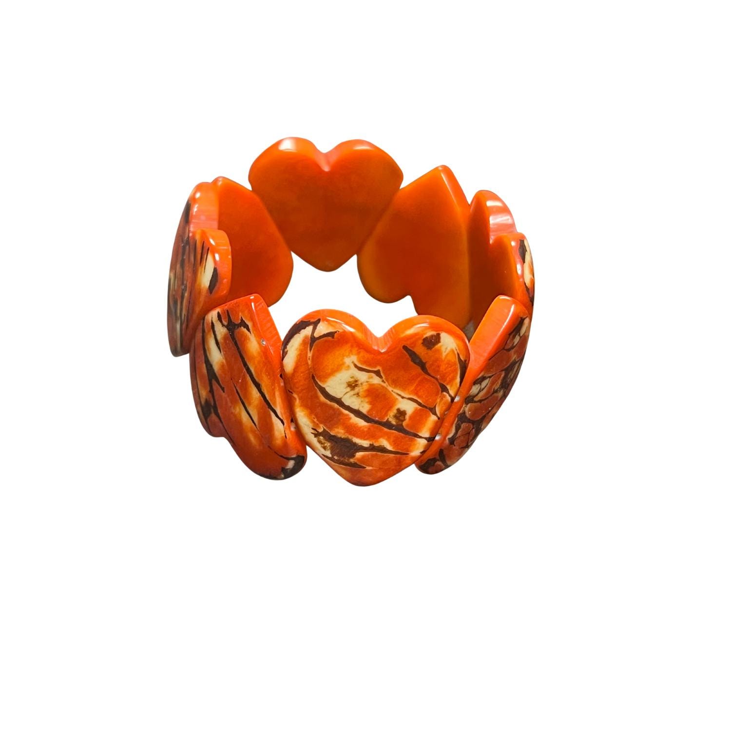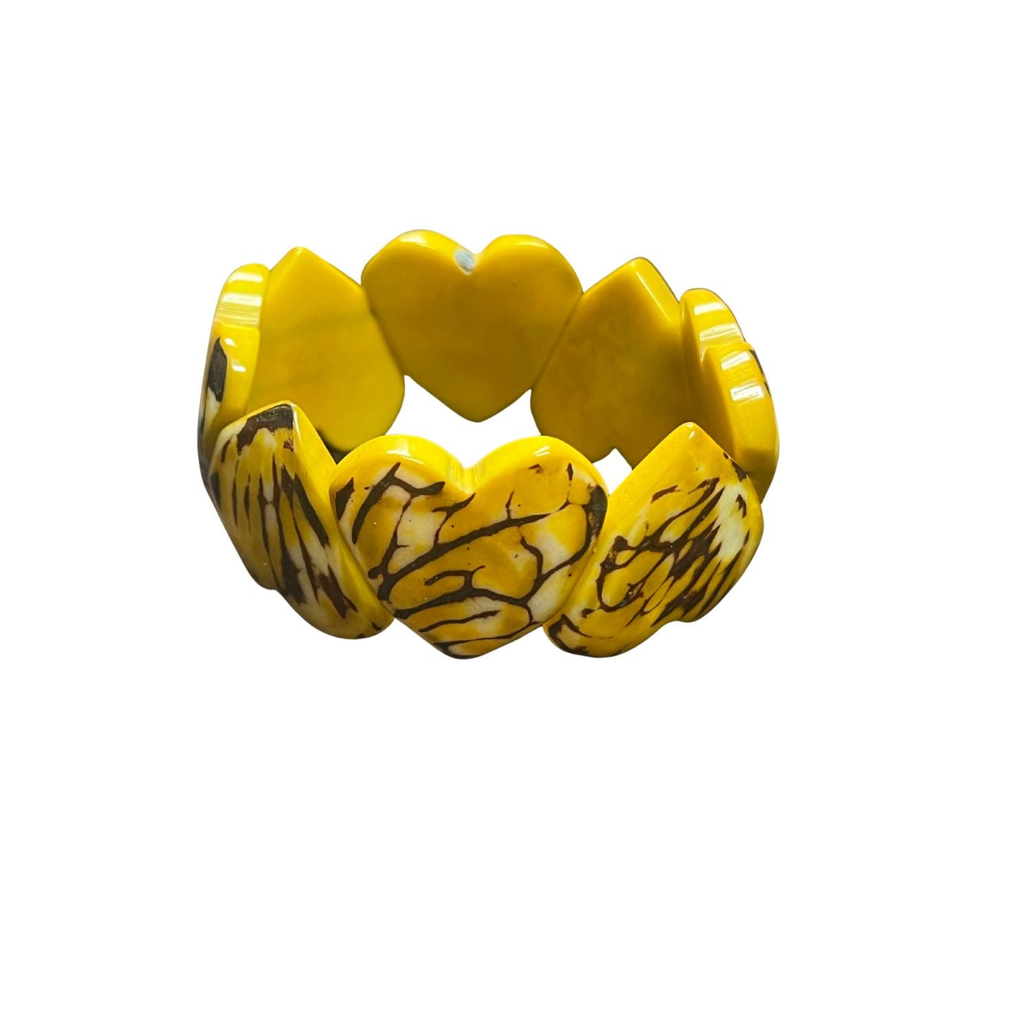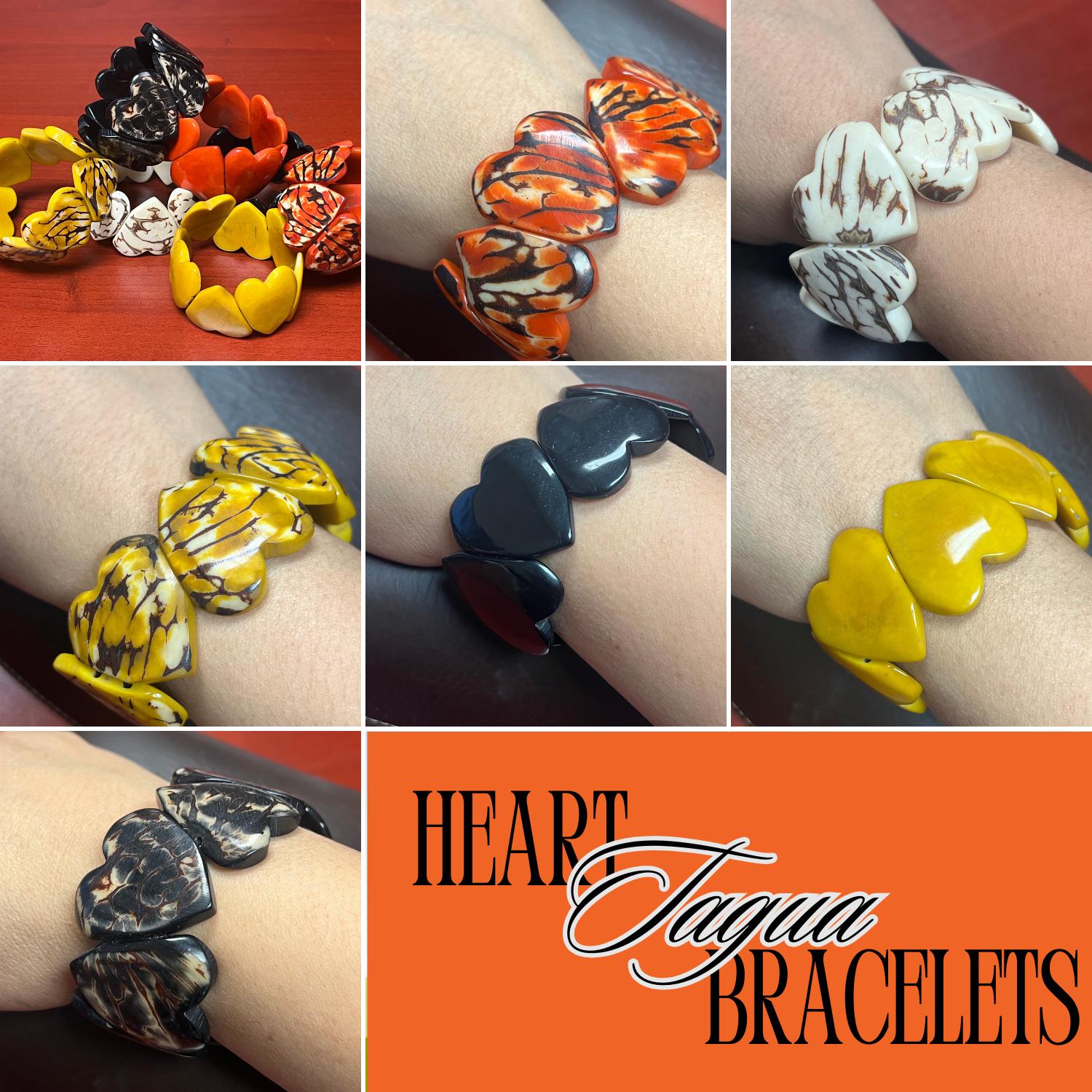 Add a pop of vibrant, sustainable style to your wardrobe with this handcrafted bracelet made from natural Tagua nuts, also known as vegetable ivory. This bold statement piece features smooth, polished heart-shaped beads in a rich hue, artfully arranged in a stretch design for easy wear and comfort.