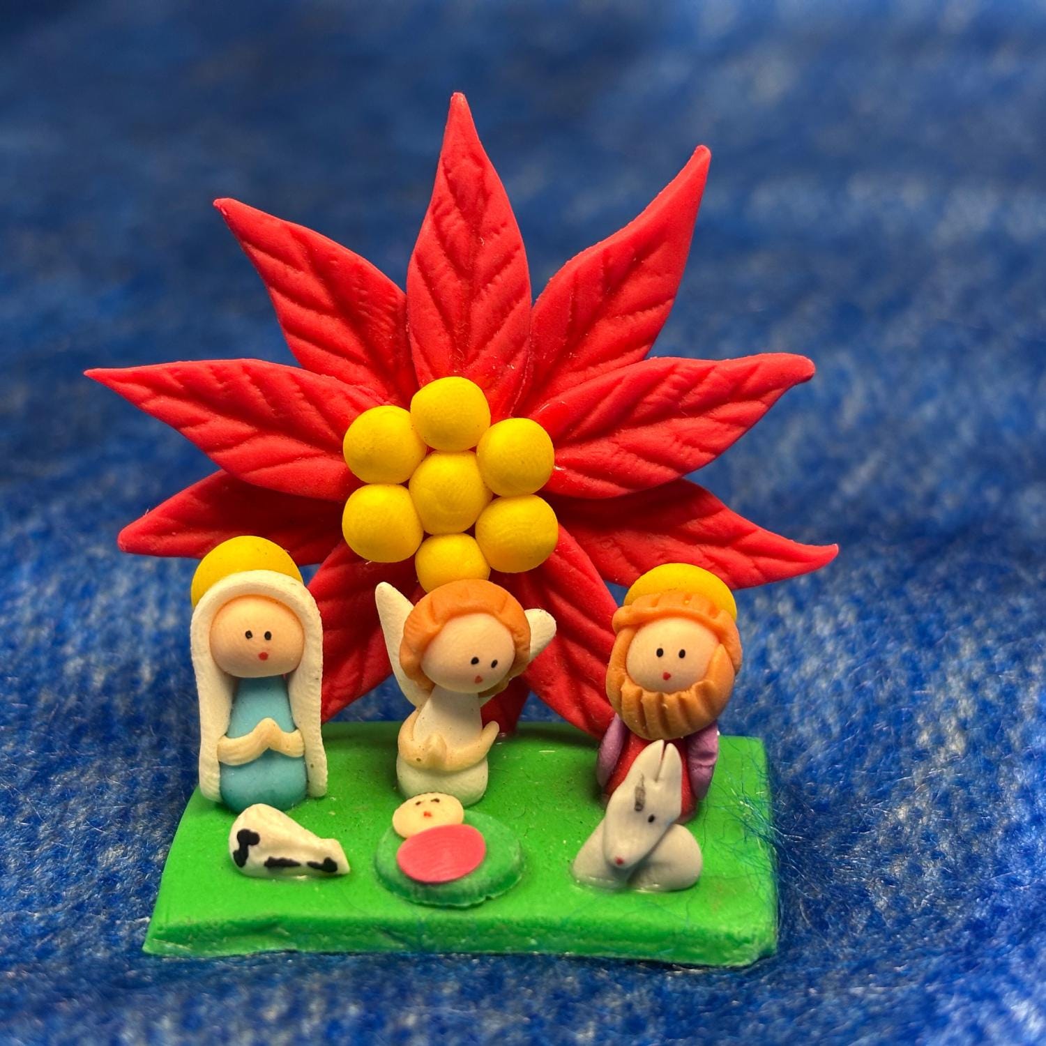 This charming miniature nativity scene is lovingly handcrafted from polymer clay and designed to bring a touch of warmth and whimsy to your holiday décor. The set features sweet, tiny figures including Mary, Joseph, an angel, baby Jesus, and small animals, all arranged on a bright green base. Behind them stands a vibrant red poinsettia with cheerful yellow centers, adding a festive pop of color and creating a perfect Christmas focal point.