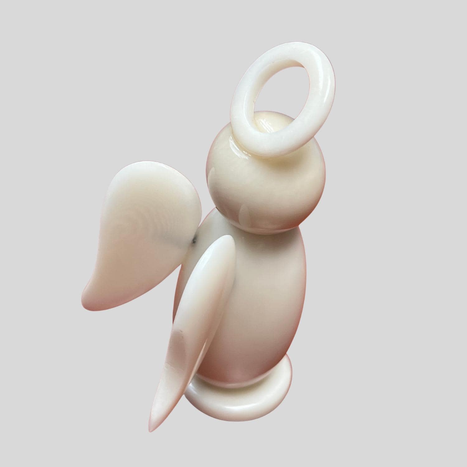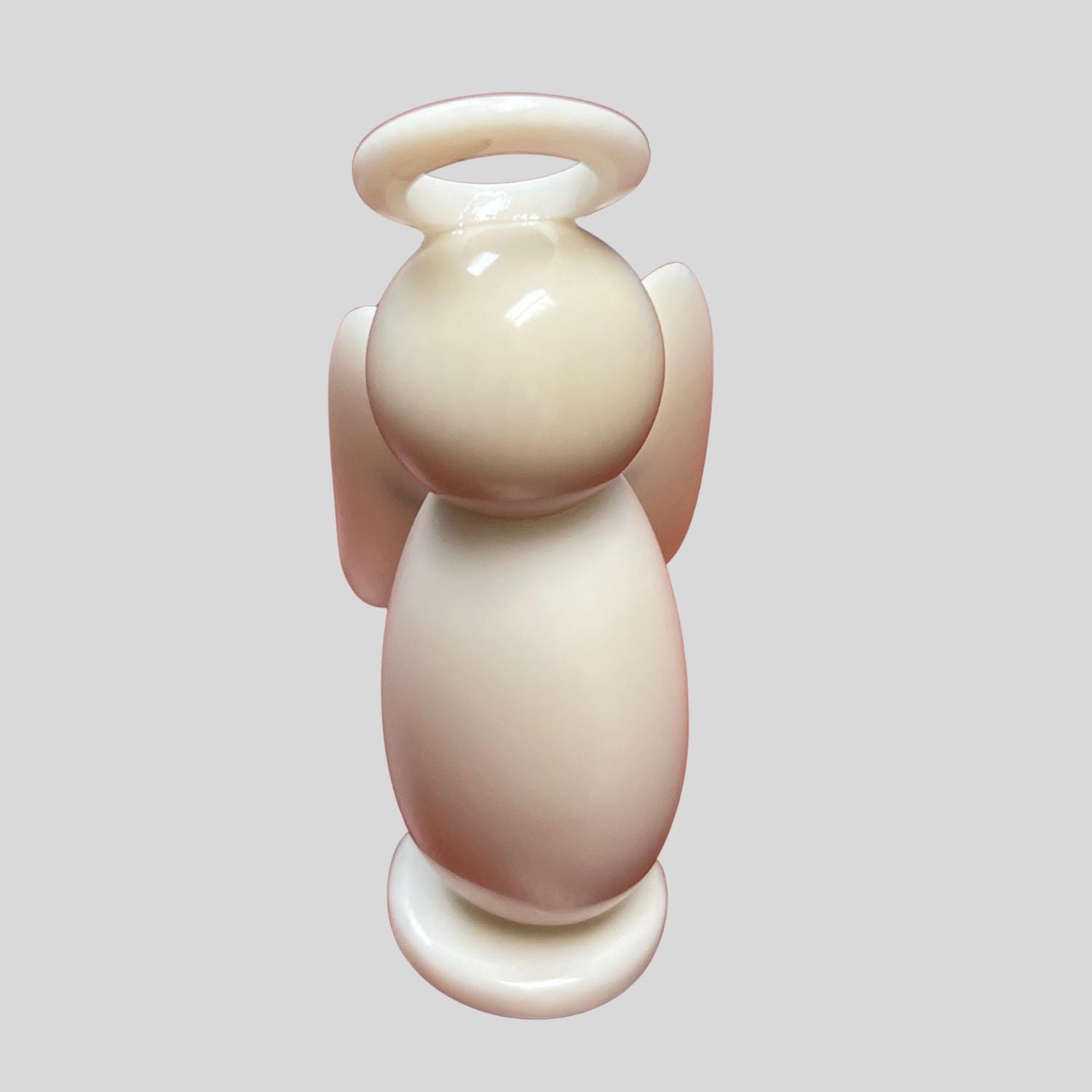 This beautiful, crafted angel figurine is made from genuine Tagua nut, often called "vegetable ivory," ethically sourced and hand-carved in Ecuador. The piece features a smooth, minimalist design with a rounded head, delicate halo, softly curved wings, and a tapered body set on a small circular base. Its natural ivory-like sheen comes from the Tagua itself, giving it an elegant, organic look.