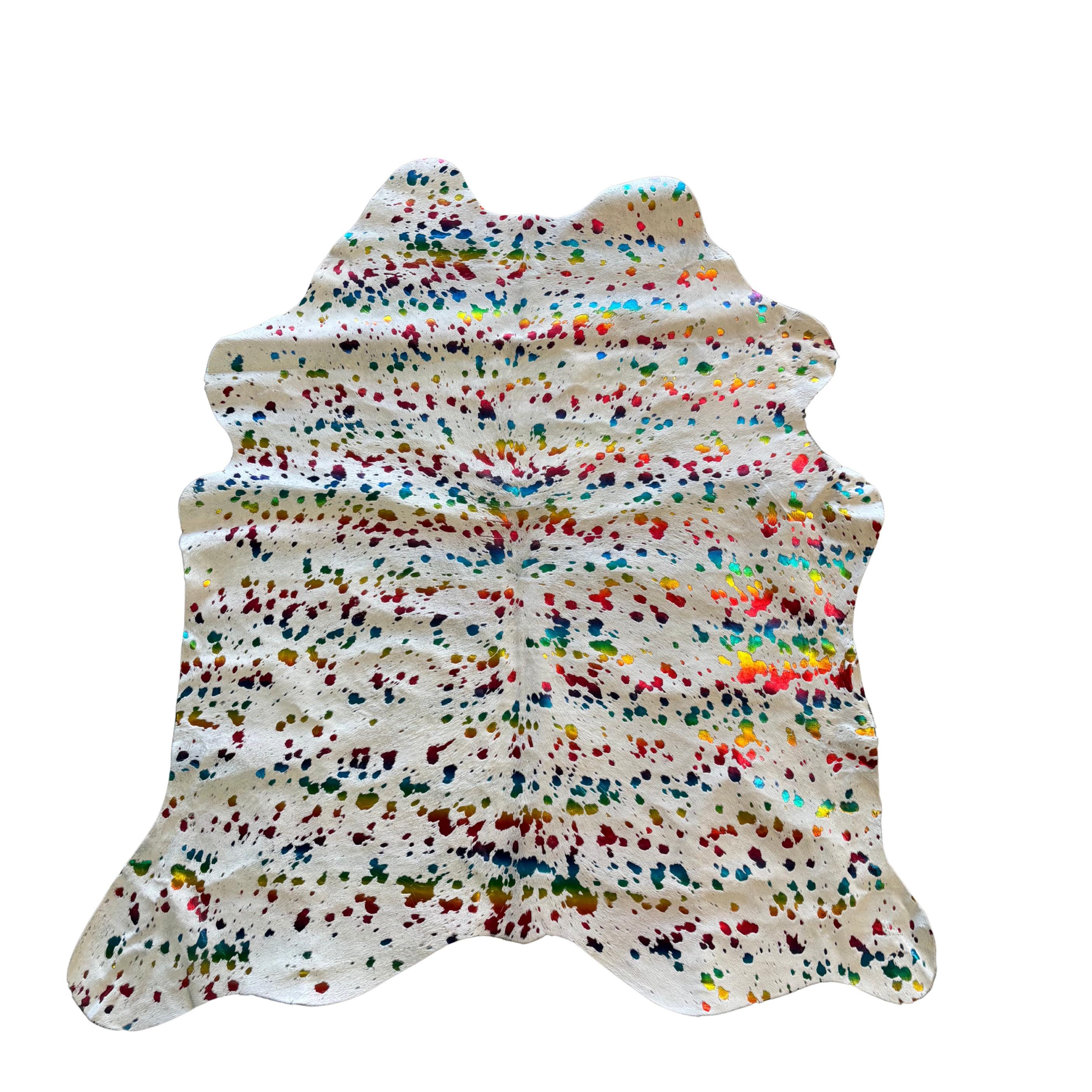 Rainbow Splatter Calfskin Rug | Hand-Painted Metallic Acid Wash Hide