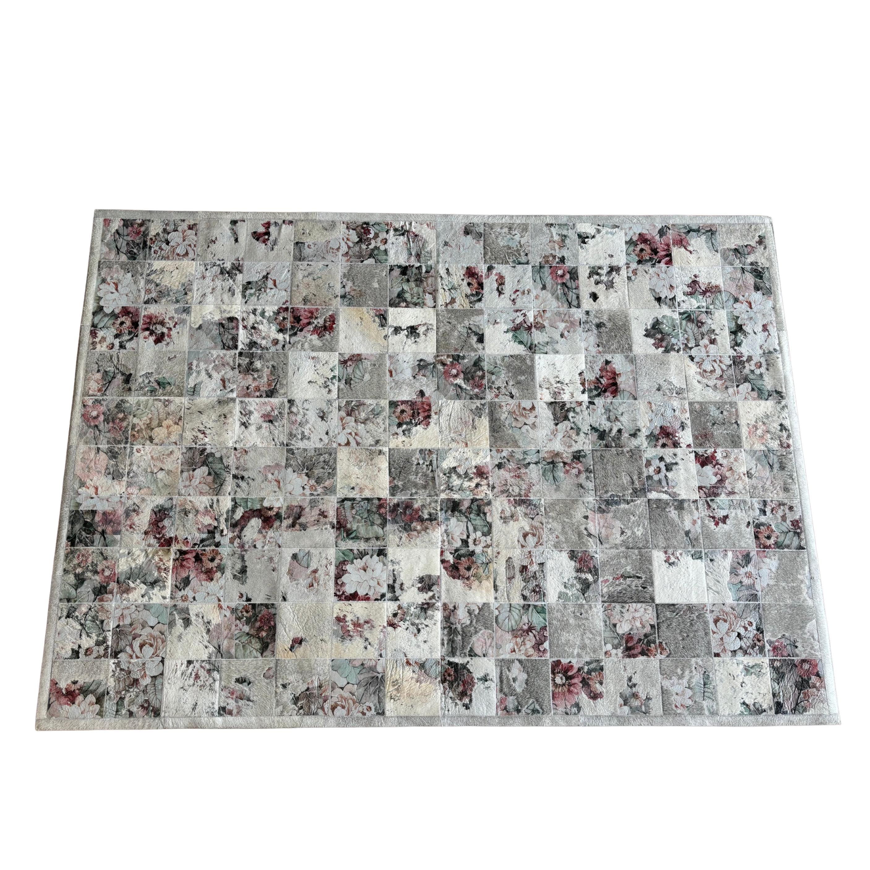 Floral Cowhide Patchwork Rug | Grey Vintage Botanical Leather Rug (5x7 ft.)