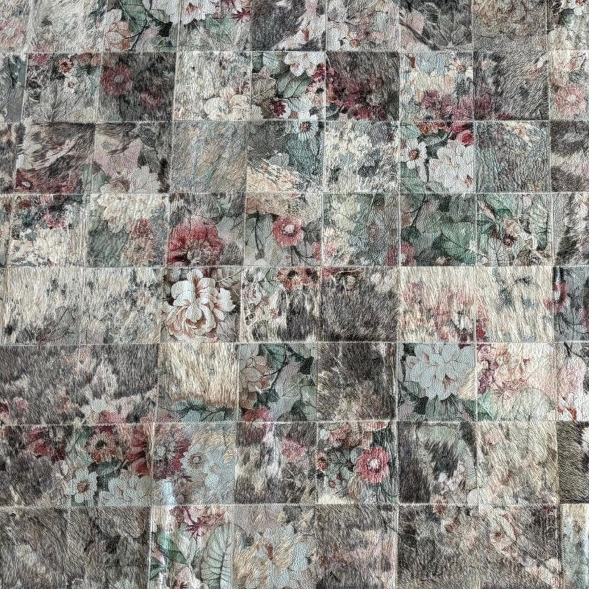 Beautiful craftsmanship of our natural cowhide patchwork rug, showcasing the soft hair-on leather texture and carefully stitched square panels. Each section features a delicate botanical floral print layered over genuine cowhide, creating a rich blend of natural grain, subtle sheen, and vintage-inspired detail.