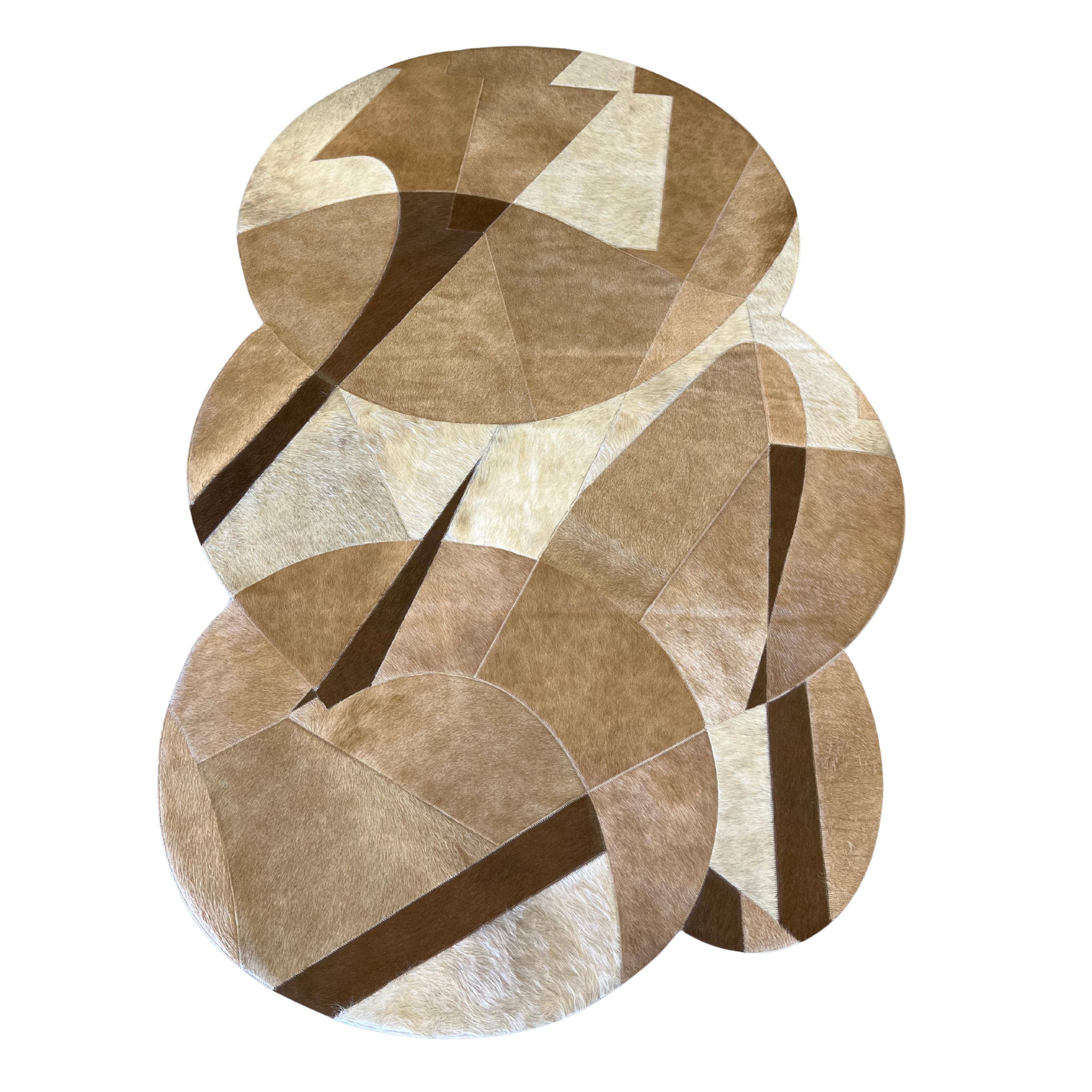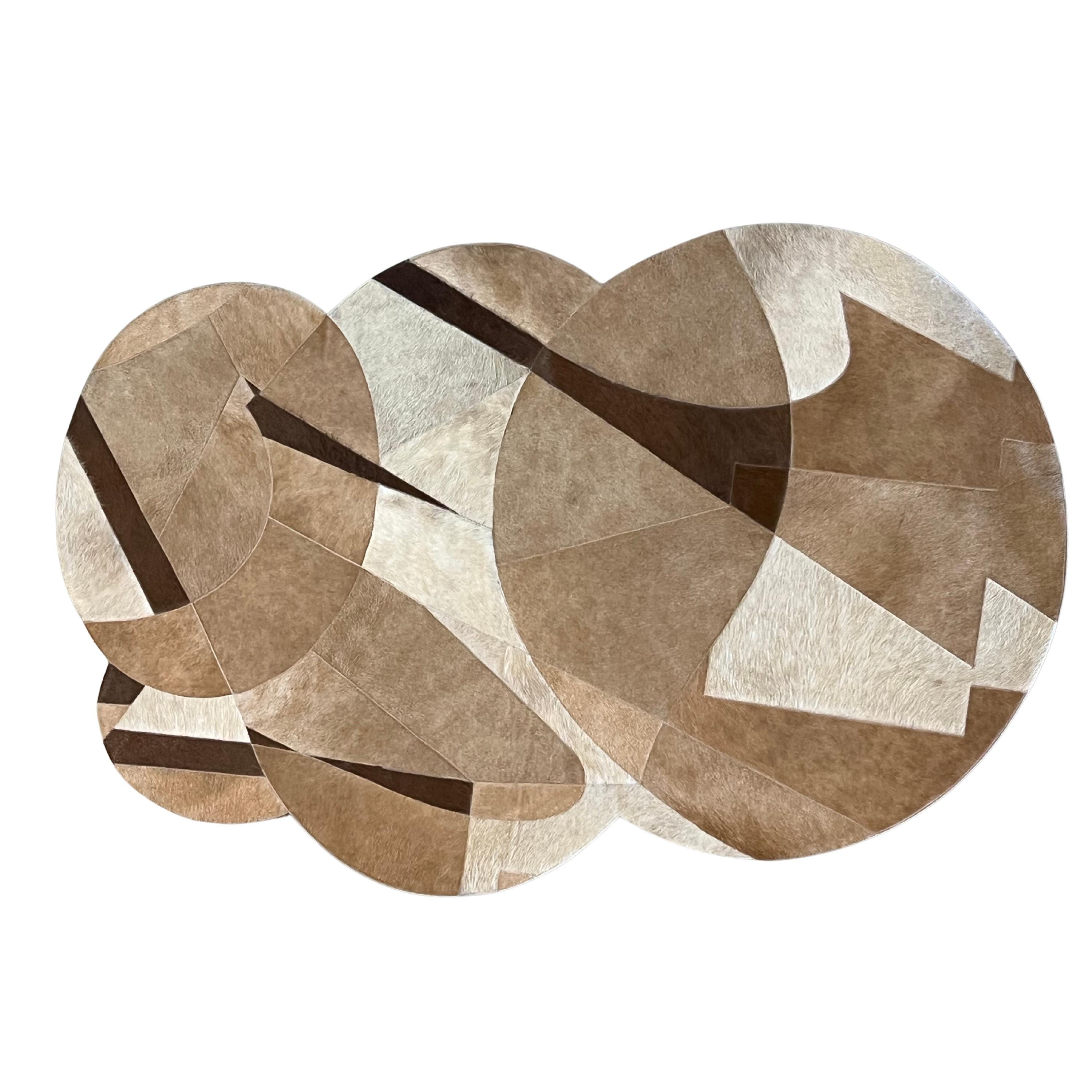 Genuine cowhide leather, the rug features an abstract geometric composition of overlapping curves and angular segments, creating a dynamic, sculptural look with beautiful depth and movement.