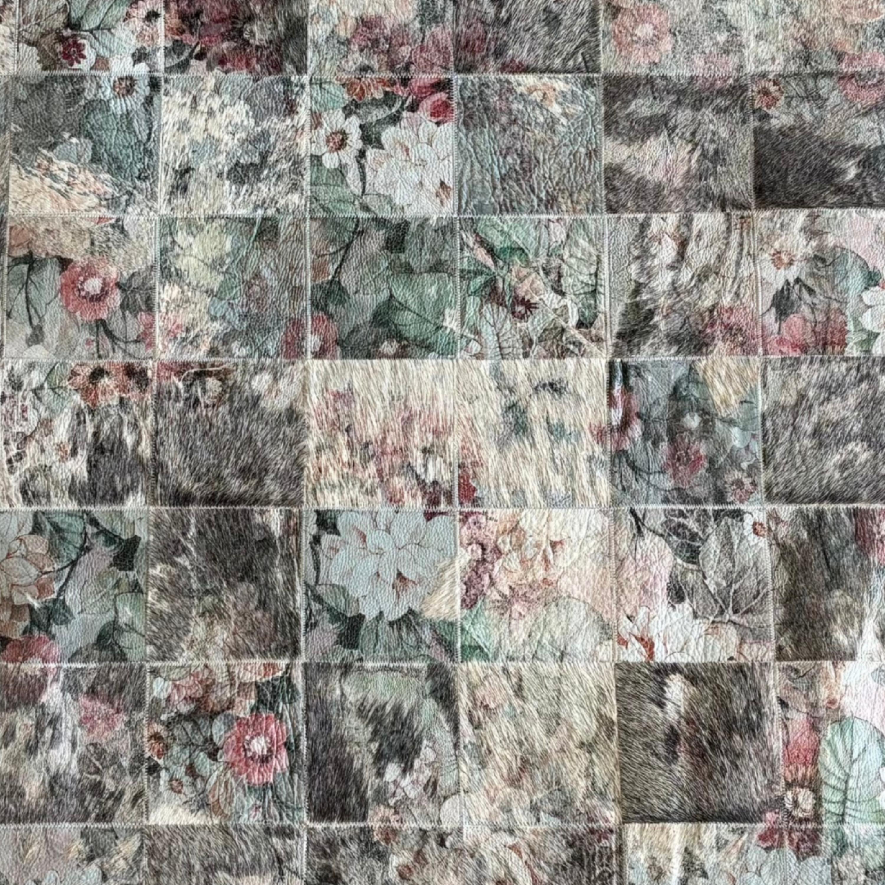 Beautiful craftsmanship of our natural cowhide patchwork rug, showcasing the soft hair-on leather texture and carefully stitched square panels. Each section features a delicate botanical floral print layered over genuine cowhide, creating a rich blend of natural grain, subtle sheen, and vintage-inspired detail.