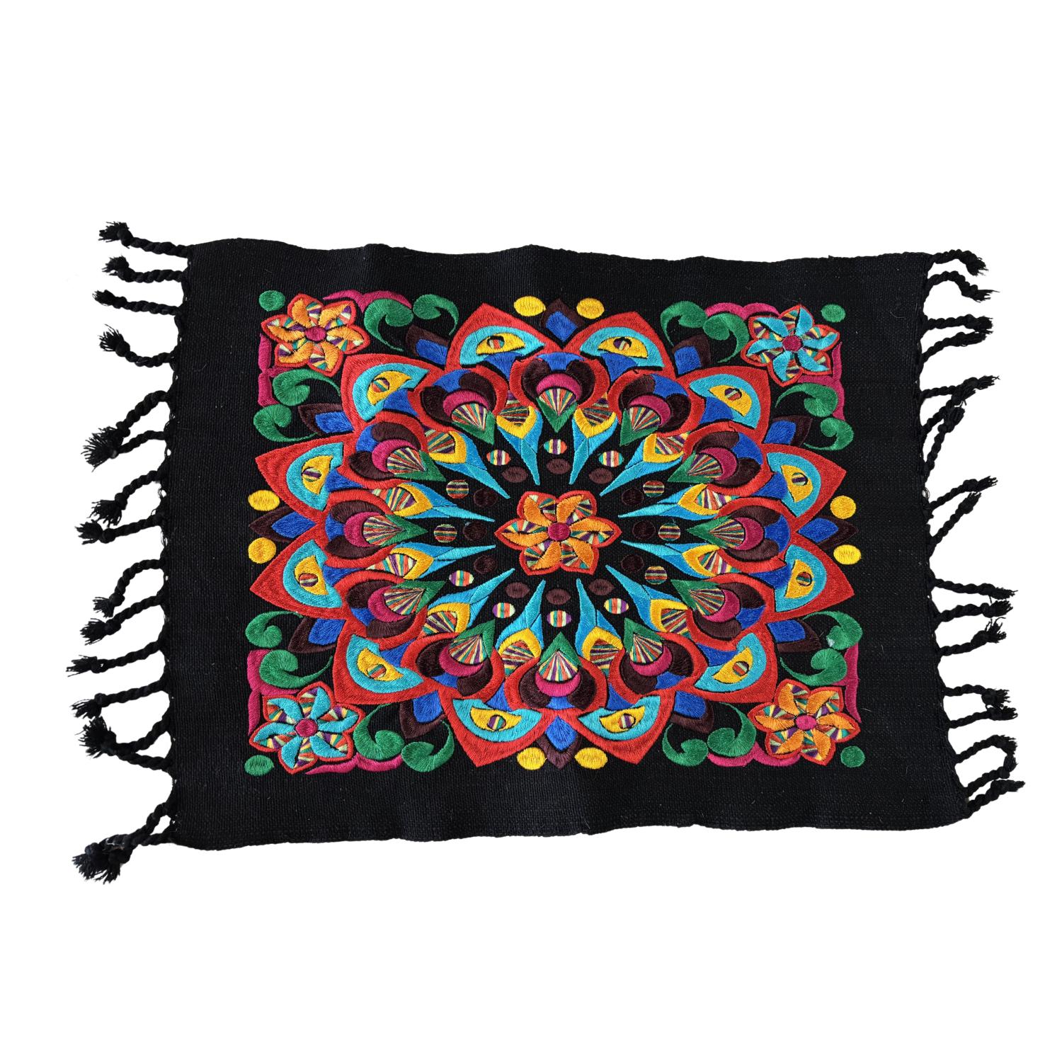 Embroidered with a colorful floral/mandala pattern on black fabric with tassels.