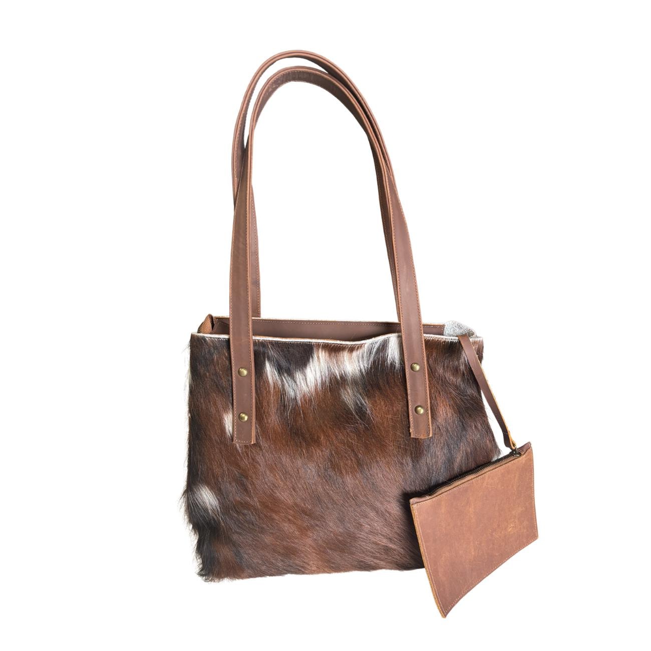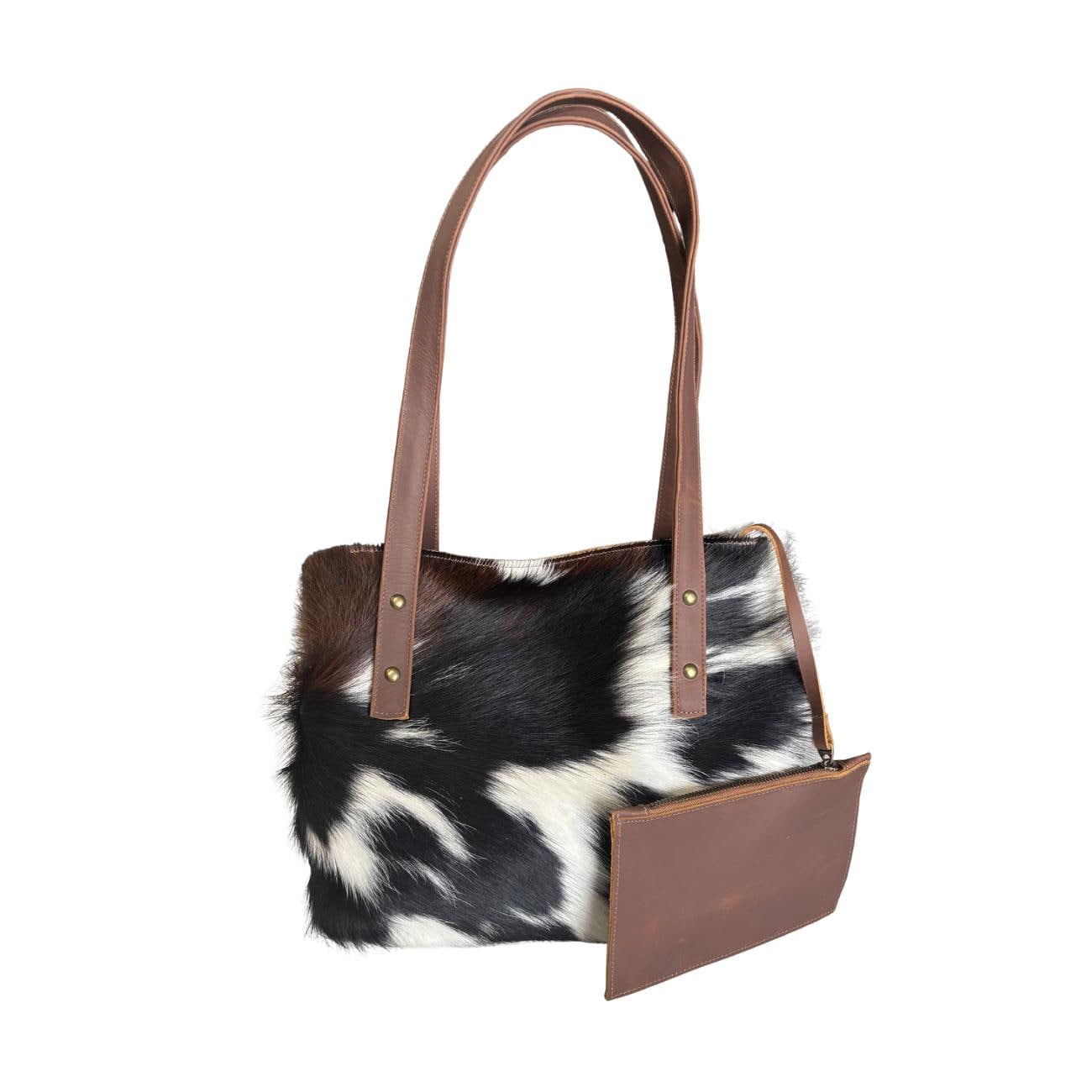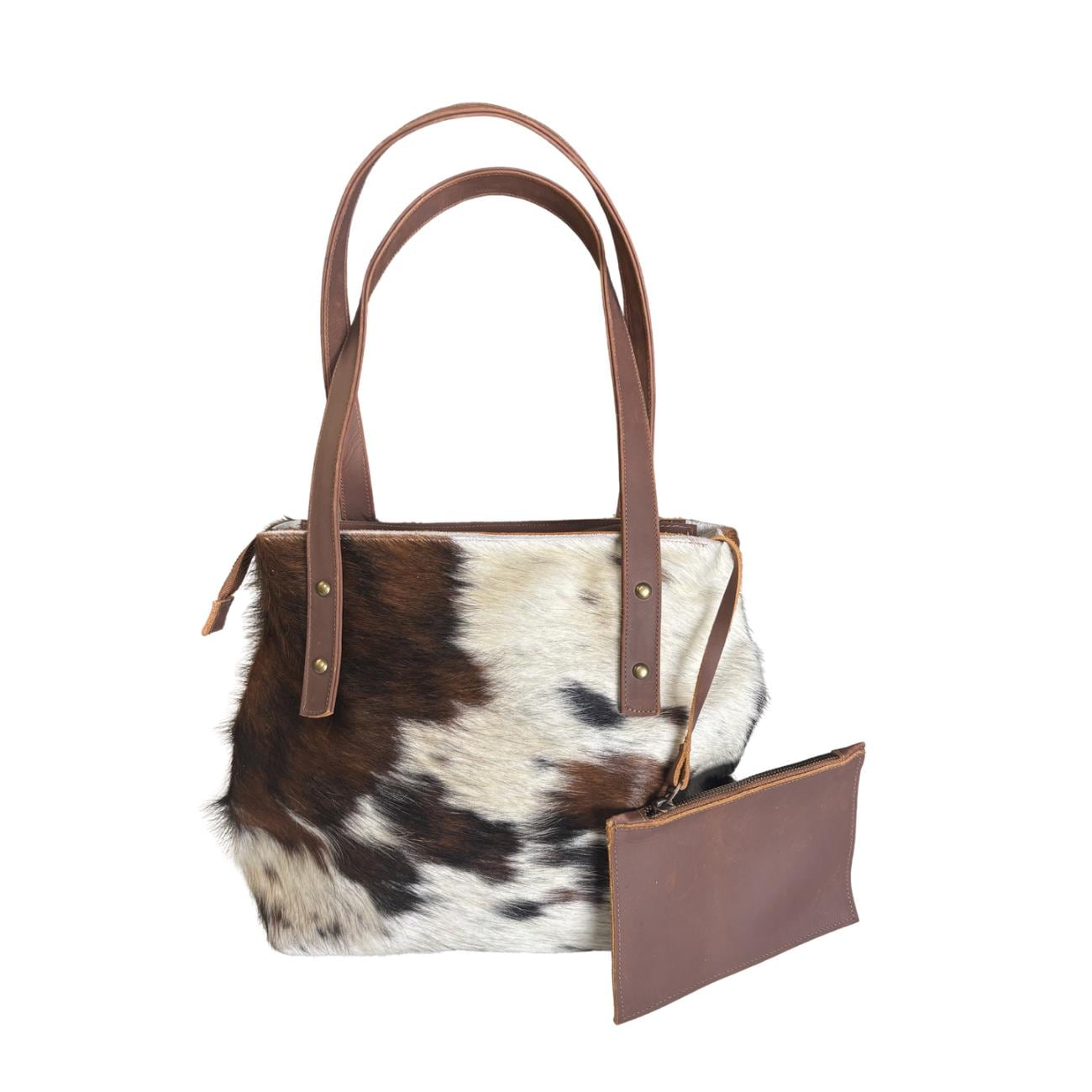 Leather Tote Bag with Zipper, Hair on Hide Handbag with Matching Pouch, Western Style Purse, Handmade Leather Shoulder Bag