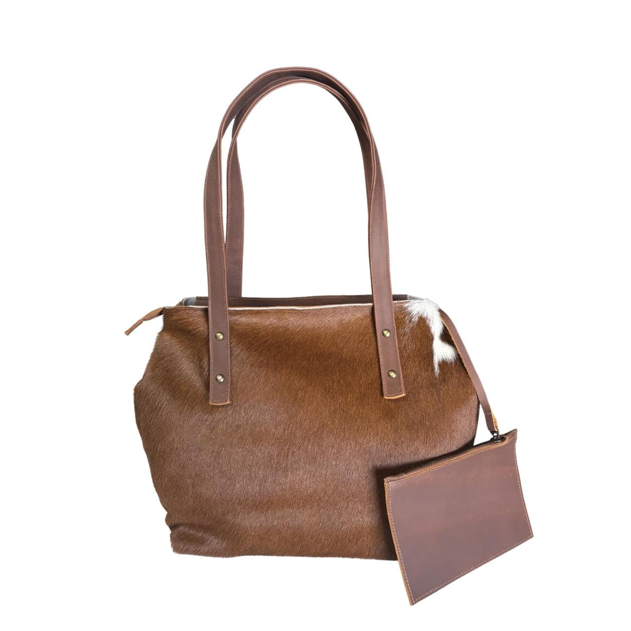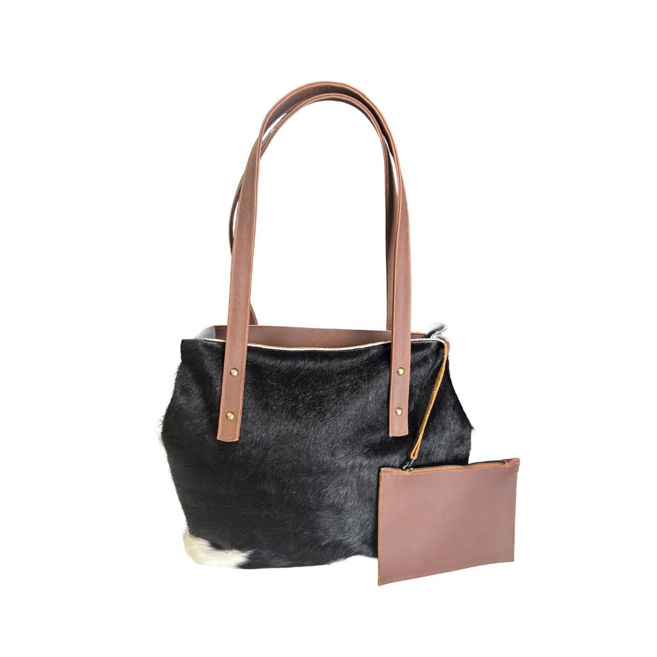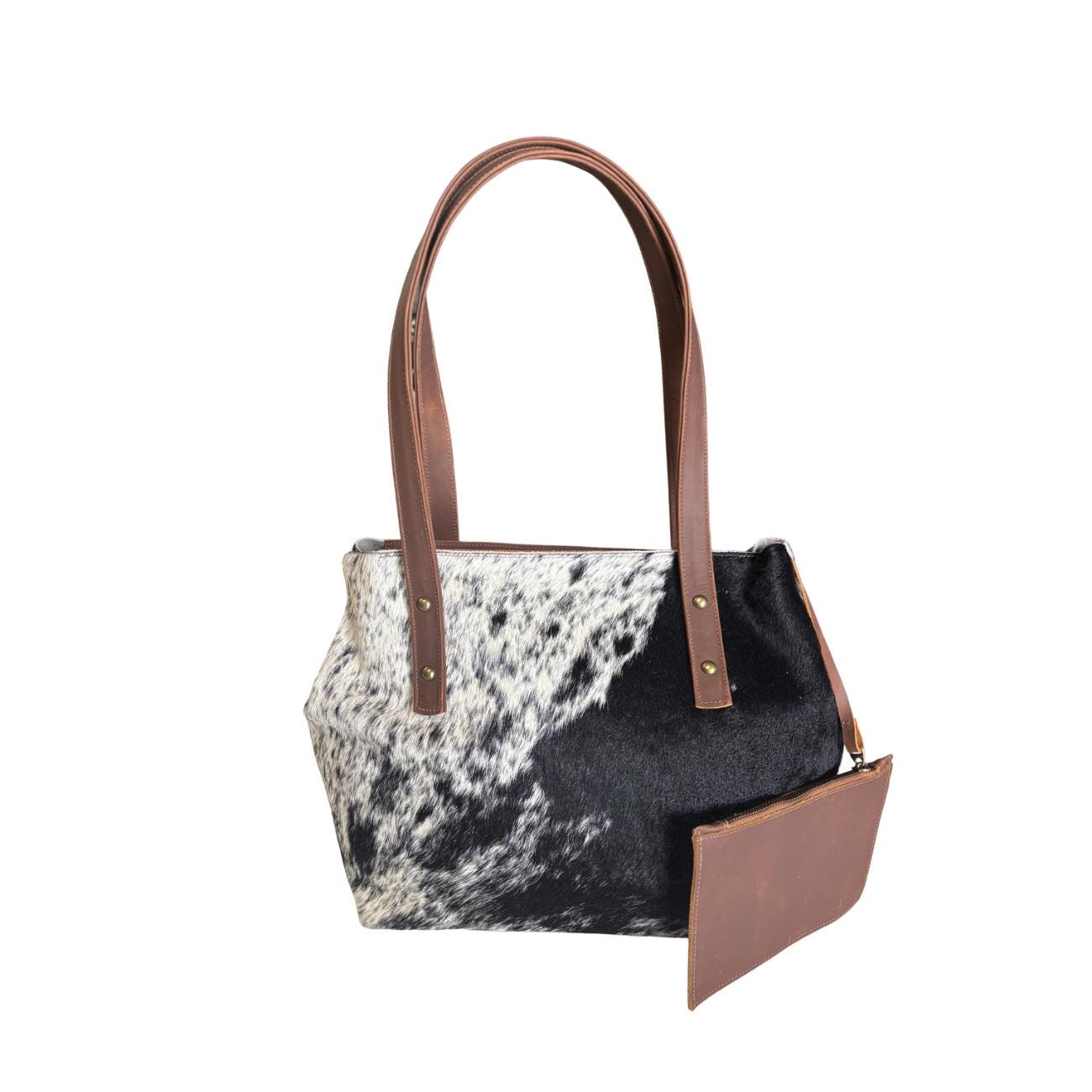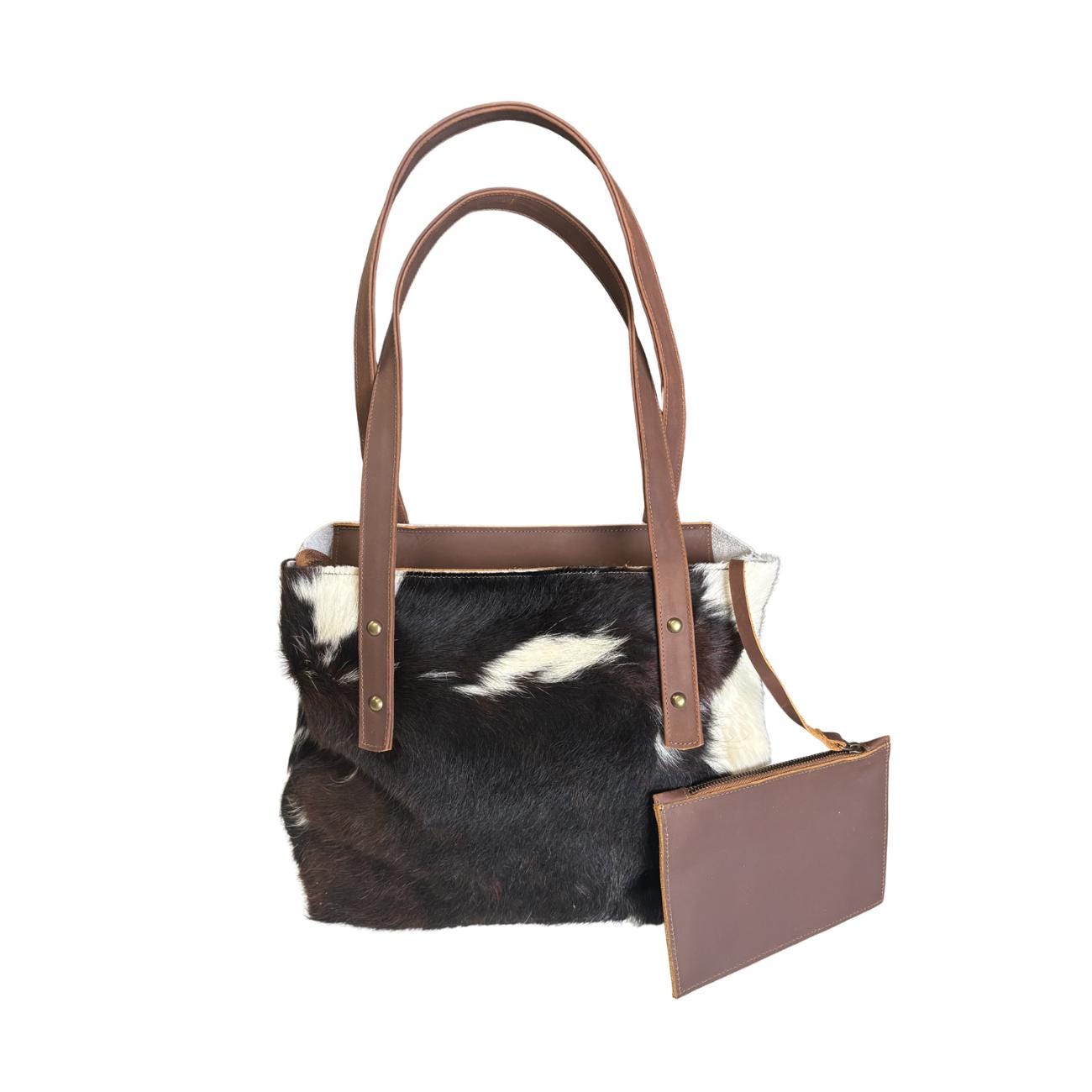 Leather Tote Bag with Zipper, Hair on Hide Handbag with Matching Pouch, Western Style Purse, Handmade Leather Shoulder Bag