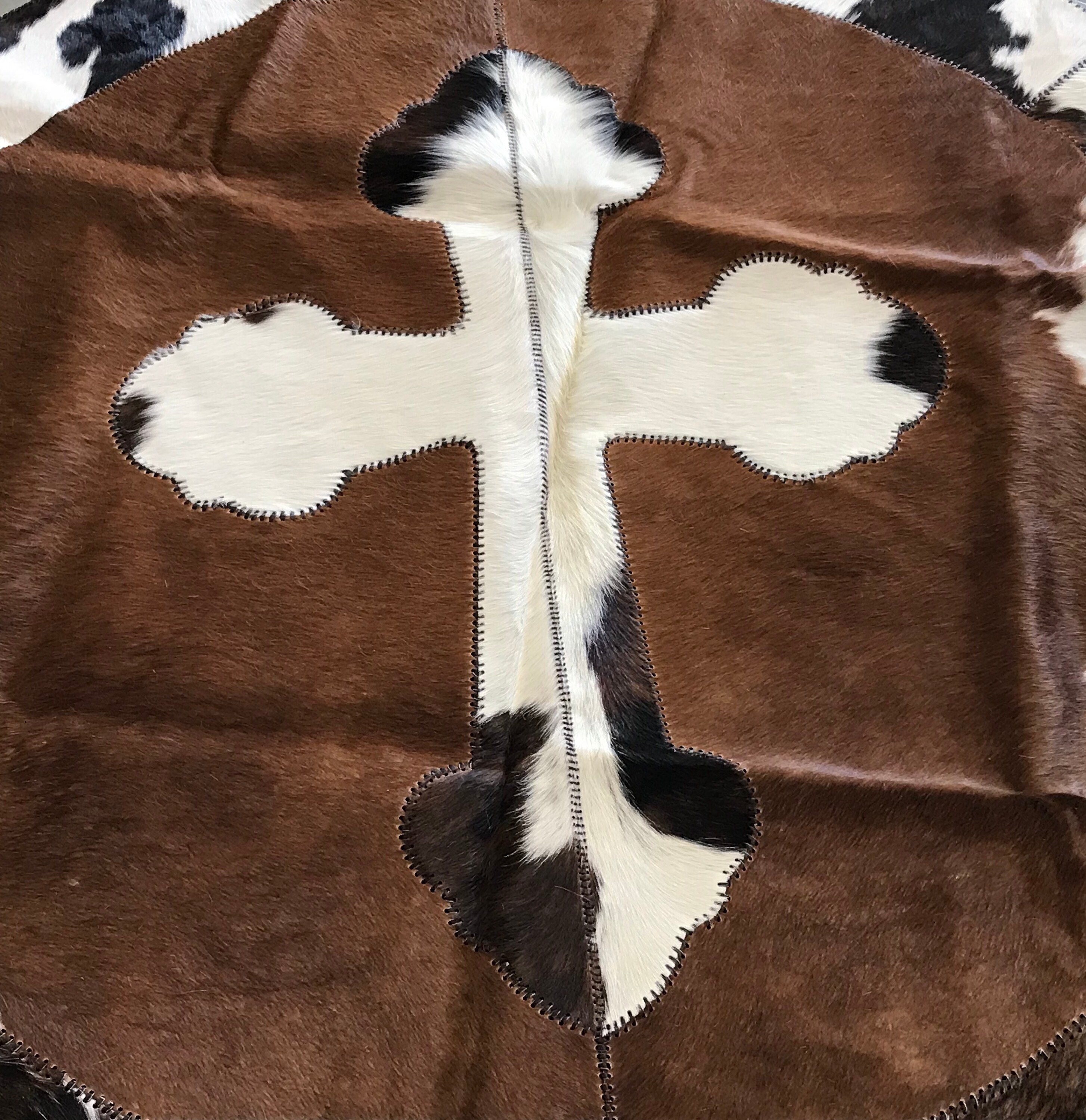 60 inch Round Cowhide Rug with Cross- Handmade -Patchwork Area Rug -Leather Stitching- FREE SHIPPING